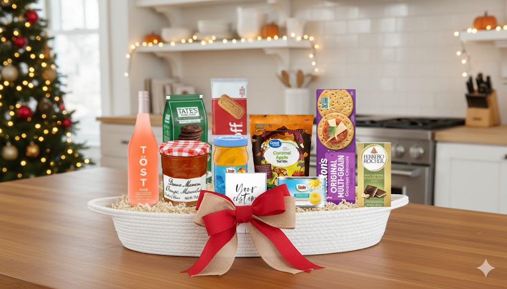 Cozy touches like a Holiday Scented Candle, Tate’s Cookies, Nutella & Go, Sillycow Farms Hot Chocolate, and Bonne Maman Marmalade make this basket ideal for new homeowners, housewarmings, relocations, or heartfelt welcomes.